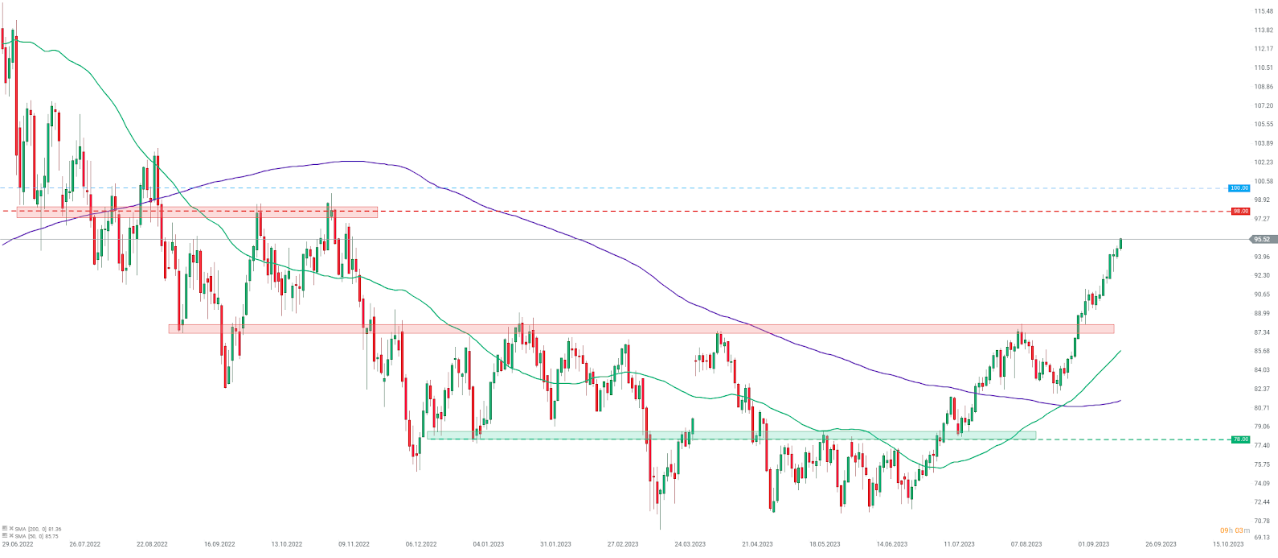 Si observamos el gráfico del Brent en el intervalo D1, podemos ver que el precio está en máximos diarios, por debajo de la marca de 95,50 dolares. Los precios del petróleo han subido más del 15% desde su mínimo de finales de agosto y los analistas del mercado, así como los expertos de la industria petrolera, dicen que pronto se podrían alcanzar los 100 $por barril. Sin embargo, si bien parece que se está generando consenso en torno a la previsión de que se superarán los 100 $, se acepta casi igualmente que cualquier ruptura de este tipo será de corta duración, dado lo rápidas que fueron las ganancias recientes, lo fuertemente sobrecomprado que está el mercado y cómo los fundamentos no justifican dicha superación. niveles de precios. La resistencia a tener en cuenta a corto plazo se puede encontrar en la zona de los 98 dólares por barril (alrededor de un 2,5% por encima del precio actual de mercado) y está marcada por máximos locales a partir de la segunda mitad de 2022.
