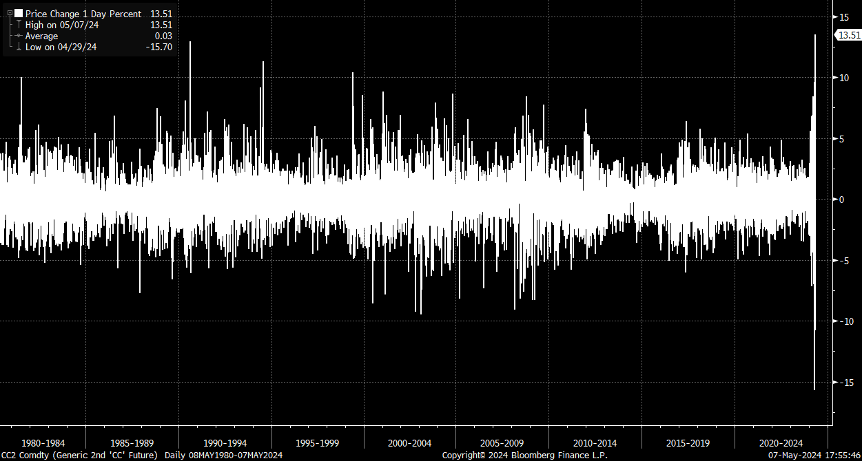 Cambios diarios sobre el cacao. Anteriormente, estos fuertes aumentos diarios se registraron en la década de 1990. Fuente: Bloomberg Finance LP, XTB