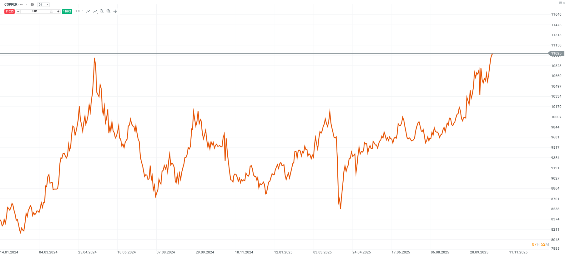 El cobre cotiza actualmente en torno a los 11.025 USD, tras un retroceso desde los máximos recientes, como puede verse en el gráfico. Esto sugiere que los fundamentos siguen siendo sólidos y que los retrocesos podrían representar oportunidades para los inversionistas de mediano plazo.