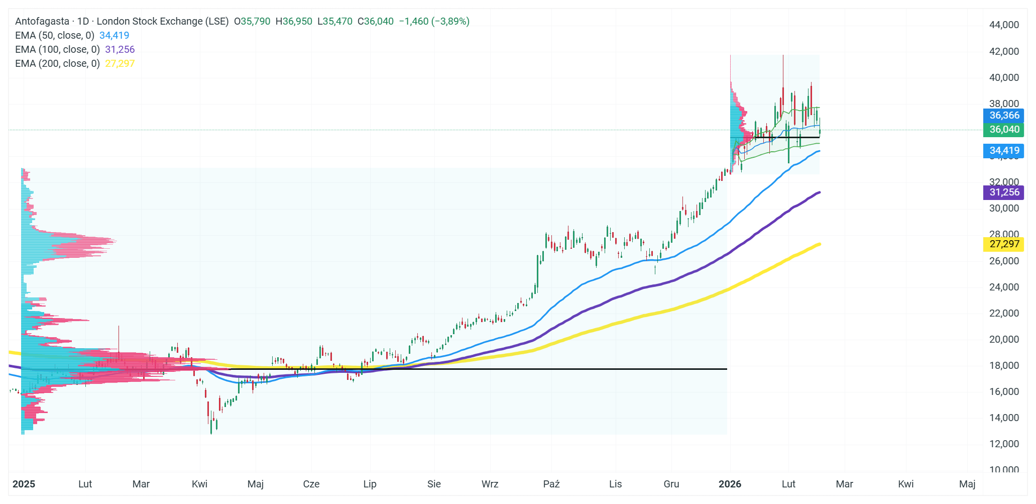 Las acciones de Antofagasta comenzaron la sesión de hoy con un gap bajista en respuesta a los resultados. A largo plazo, sin embargo, la compañía mantiene una tendencia alcista estable. Es importante destacar que el precio se encuentra actualmente en una zona de soportes volumétricos relevantes desde comienzos de año, tanto en términos de VWAP como de perfil de volumen.