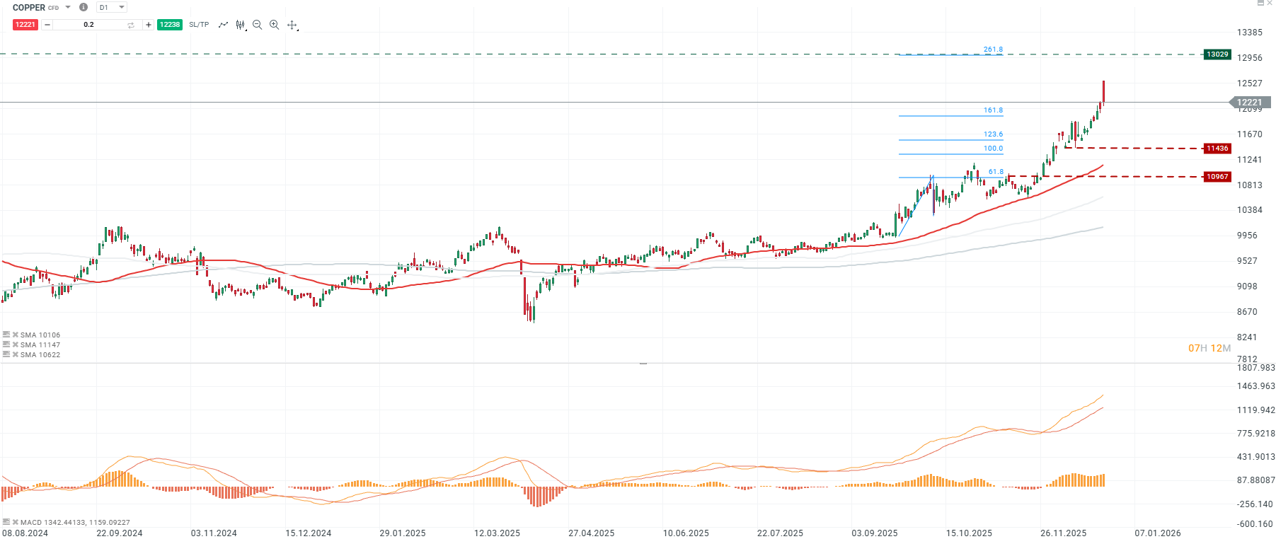 En la cotización observada hoy en el gráfico, el cobre se mueve en torno a 12.221 (referencia visual del precio actual), tras un avance fuerte en el tramo final del año. En términos de niveles destacados en la imagen, se observan zonas de referencia que el mercado suele vigilar: