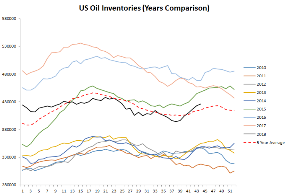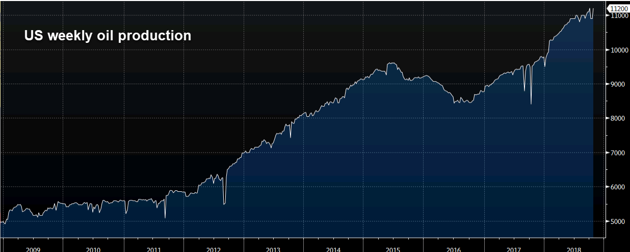 Los inventarios de gasolina y destilados están enviando mensajes mixtos aquí, pero la producción podría considerarse bastante negativa para el mercado. Una lectura de 11,2 millones de barriles por día está en línea con el máximo del ciclo y sugiere que EE. UU. continúa aumentando su producción, que ha aumentado durante la última década debido a la revolución del esquisto.
