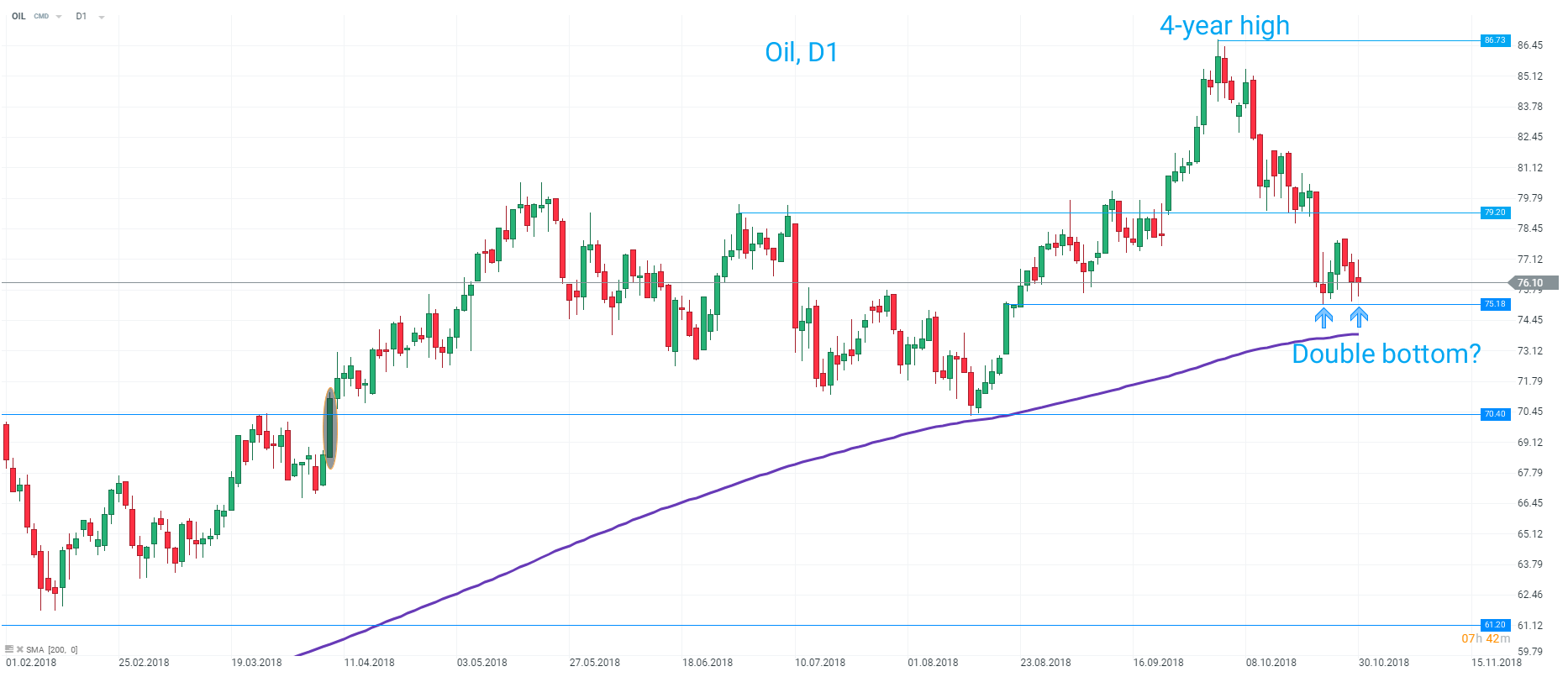 El petróleo ha tenido un mal mes con fuertes descensos y ha caído más de 10 $ después de alcanzar un máximo de 4 años a principios de octubre en 86.73 $. El mercado parece estar todavía en una tendencia alcista a más largo plazo, con un precio que se mantiene por encima de la media móvil de 200 días y si el soporte a corto plazo en torno a 75.20 $ se mantiene, entonces se habrá formado el doble suelo. Fuente: xStation