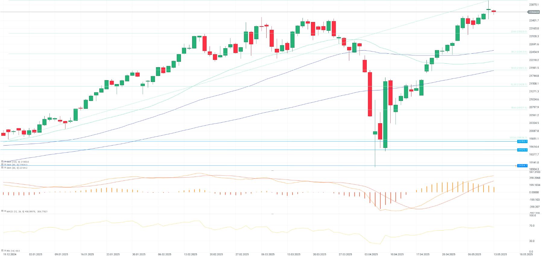 El índice alemán, el Dax 40, retrocede ligeramente tras alcanzar un nuevo máximo histórico ayer, pero se mantiene por encima del nivel de retroceso de Fibonacci del 23,6% y de la media móvil simple (SMA) de 50 días, ambos como soportes clave. Los alcistas buscarán mantener el impulso por encima de los máximos recientes para confirmar la ruptura, mientras que los bajistas podrían intentar impulsar el índice por debajo de esos niveles, con la media móvil simple (SMA) de 50 días como objetivo a corto plazo. El RSI se mueve ligeramente por debajo de la zona de sobrecompra, lo que indica una posible desaceleración del impulso alcista. Mientras tanto, el MACD comienza a estrecharse, lo que indica cautela, ya que la presión compradora podría estar perdiendo fuerza. Fuente: xStation