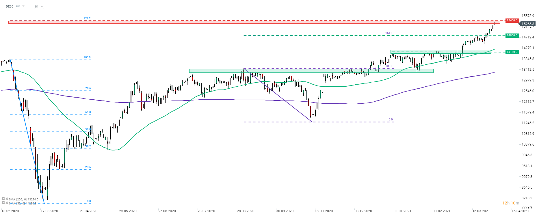 DE30 inició operaciones con una gran brecha de precios alcista después de las vacaciones de Pascua. El movimiento alcista continuó durante el horario comercial asiático y al comienzo de la sesión europea. Se alcanzó un nuevo máximo histórico ligeramente por debajo de la marca de 15,340 pts. Sin embargo, los alcistas no pudieron mantener esas ganancias y se lanzó un retroceso. El índice ha encontrado un soporte local en 15,250 pts y los intentos de lanzar otro impulso alcista desde allí están al cierre de esta edición. La principal zona de resistencia a observar oscila cerca del nivel de 15,400 pts y está marcada con el retroceso exterior del 127.2% de la caída pandémica de principios de 2020.