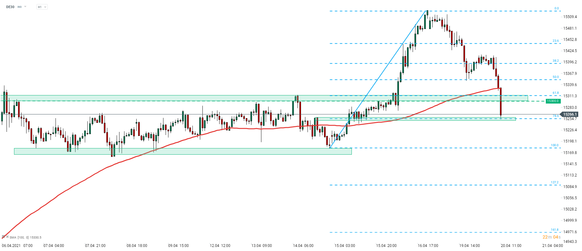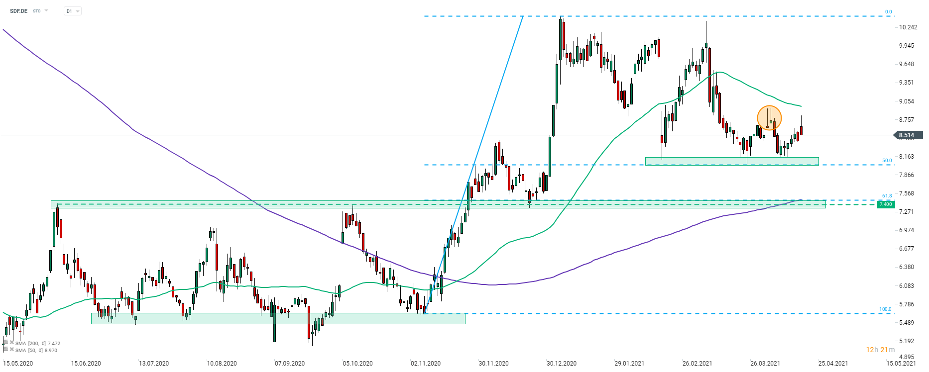 K + S (SDF. Sin embargo, el movimiento alcista no se mantuvo y la acción retrocedió hacia el precio de cierre de ayer. Tenga en cuenta que las velas con mechas superiores largas han anunciado una reversión a principios de abril, por lo que los alcistas deben mantenerse en guardia. En caso de que la acción continúe moviéndose a la baja, la zona que se ubica por encima del 50% de retroceso del impulso alcista de fines de 2020 debe verse como un soporte a corto plazo. Fuente: xStation5