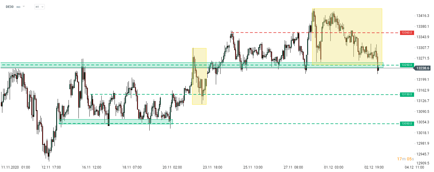 DE30 cayó por debajo de la zona de soporte de 13,250 pts, marcada con el límite inferior de la estructura de Overbalance, hoy. En teoría, tal desarrollo marca una inversión de tendencia a corto plazo. Sin embargo, las caídas se detuvieron ligeramente por debajo de esta zona hasta ahora y es posible que el índice aún pueda volver a subir por encima de ella al final del día. Dicho esto, es mejor esperar una confirmación sobre el intervalo D1 antes de usar dicha señal. Si continúan las caídas, los niveles de soporte a seguir están marcados con límites de un rango de negociación a corto plazo desde mediados de noviembre: 13,050 y 13,150 pts.