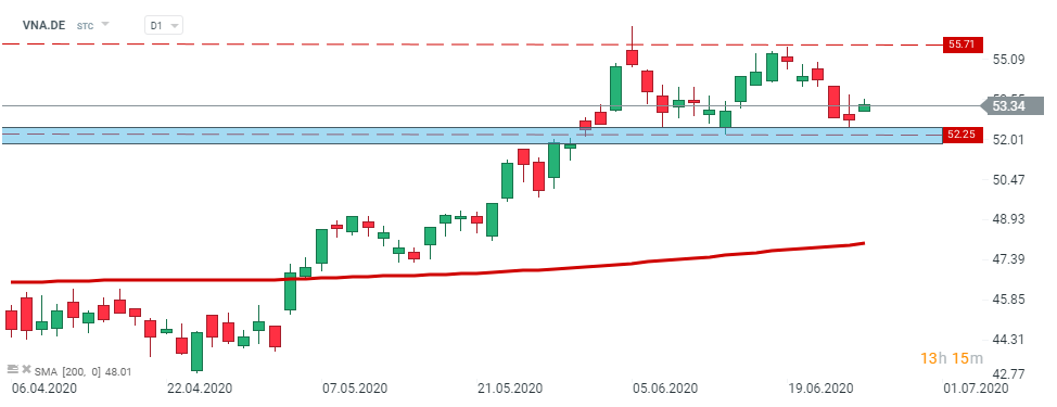 Vonovia (VNA.DE) lanzó la sesión de hoy más alto. Si prevalece el sentimiento actual, los compradores deben centrarse en la resistencia en 55.71€. El soporte local se puede encontrar en 52.25€. Fuente: xStation5