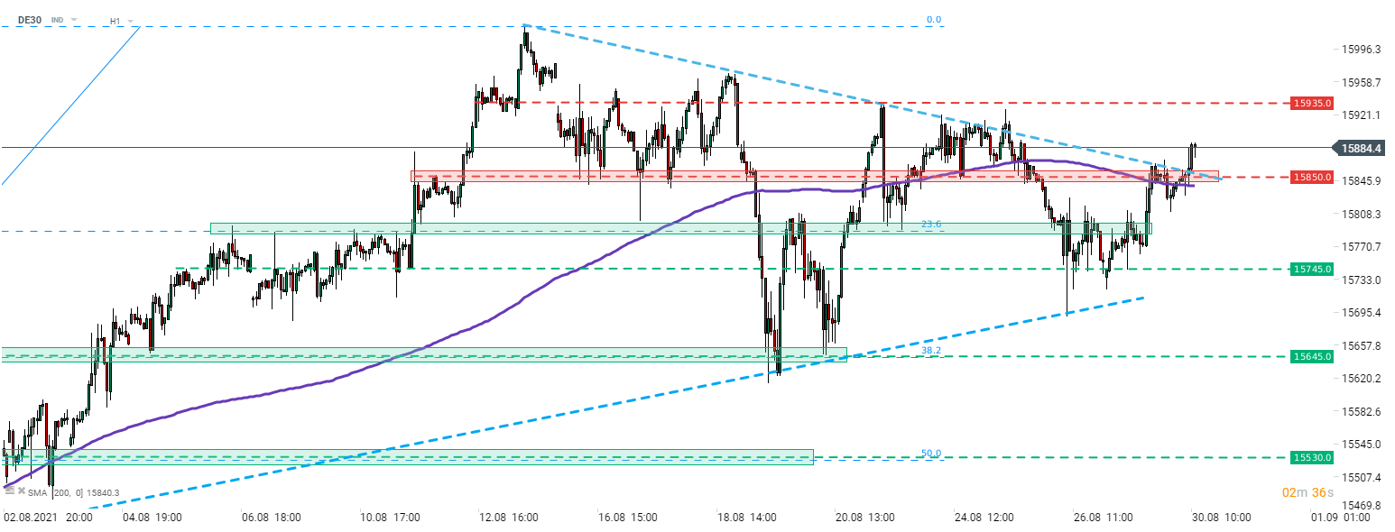 Powell se apegó a su narrativa moderada durante su discurso en Jackson Hole el viernes. Esto ha dado nuevo combustible a los alcistas de la renta variable para impulsar los índices al alza, y los estados de ánimo optimistas se extendieron a una nueva semana. DE30 ha logrado superar el límite superior del patrón de cuña y ha probado el área de 15.900 pts al comienzo de la negociación de hoy. Si bien los compradores aún no pudieron ofrecer una ruptura por encima de él, el índice permanece cerca. En caso de que la pausa actual se convierta en retroceso, el soporte a corto plazo a observar se puede encontrar en el área de 15,850 pts, donde también se puede encontrar la línea de tendencia bajista rota anteriormente. El área de resistencia principal más cercana oscila alrededor de la marca de 15.935 pts.
