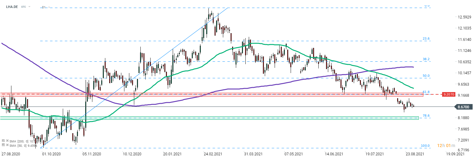 Los informes que dicen que los planes de Lufthansa para aumentar la cantidad de vuelos ofrecidos a los viajeros de negocios no cambiaron la opinión sobre las acciones. Las acciones de Lufthansa (LHA.DE) cotizan a la baja hoy. En caso de que persistan los estados de ánimo pesimistas, la zona de soporte en un retroceso del 78,6% (zona de 8,15 €) puede estar en peligro. Fuente: xStation5