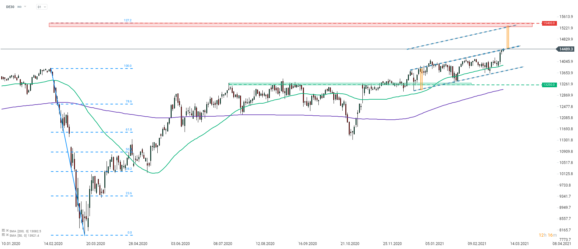 DE30 está probando el límite superior del canal ascendente de corto plazo en el área de 14,450 pts. Index ha estado luchando con este obstáculo ayer, pero no ha logrado superarlo hasta ahora. En caso de que veamos una ruptura arriba, puede seguir un movimiento ascendente igual al ancho del canal. Esto implicaría un objetivo en torno a los 15.300 ptos. Se puede encontrar un retroceso del 127.2% de la caída de la pandemia en 15,400 pts, por lo tanto, 15,300-15,400 pts puede ser la siguiente zona de resistencia importante a observar.