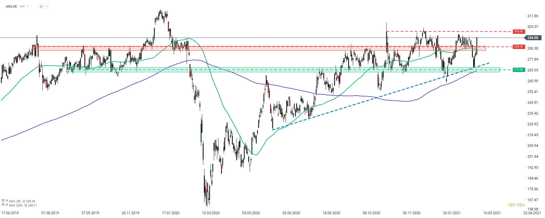 Las acciones de Adidas (ADS.DE) repuntaron tras las optimistas previsiones presentadas por la empresa. Las acciones rompieron por encima de la zona de precios a largo plazo en 288,00 € hoy y están mirando hacia un máximo local reciente. El área de 300 € que marca los máximos de YTD es la resistencia a corto plazo a observar. Fuente: xStation5