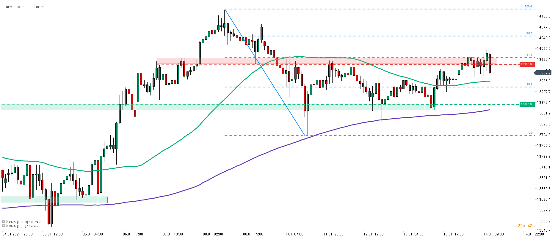 DE30 logró detener las caídas de ayer en la zona de soporte de 13,875 pts. El índice rebotó en el área y continuó recuperándose de un movimiento a la baja de principios de semana. DE30 ha logrado escalar hacia un retroceso del 61.8% en 14,000 pts. Sin embargo, el movimiento alcista se ha estancado allí ya que los alcistas no pudieron producir una ruptura significativa por encima hasta ahora. Se puede observar un retroceso en el momento de la publicación con el índice cayendo por debajo de los 13,980 pts. Si vemos la continuación del movimiento a la baja y una ruptura por debajo del área de oscilación en 13,950 pts (mínimos diarios), podría ser un fuerte indicio de que el índice está a punto de mantener su rango de negociación anterior. Los operadores deben tener en cuenta que se avecinan algunos posibles eventos de riesgo: el discurso de Powell a las 5:30 pm GMT y el discurso de Biden después de la medianoche (0:15 am GMT).