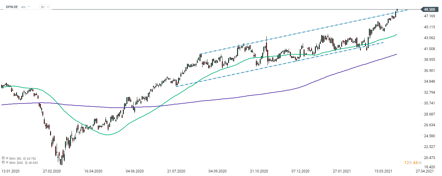 Deutsche Post (DPW.DE) amplía su movimiento alcista gracias a unos resultados preliminares optimistas y una perspectiva mejorada. Las acciones han superado el límite superior del canal ascendente y cotizan en un nuevo récord. Las acciones ganaron alrededor del 19% en lo que va de año. Fuente: xStation5