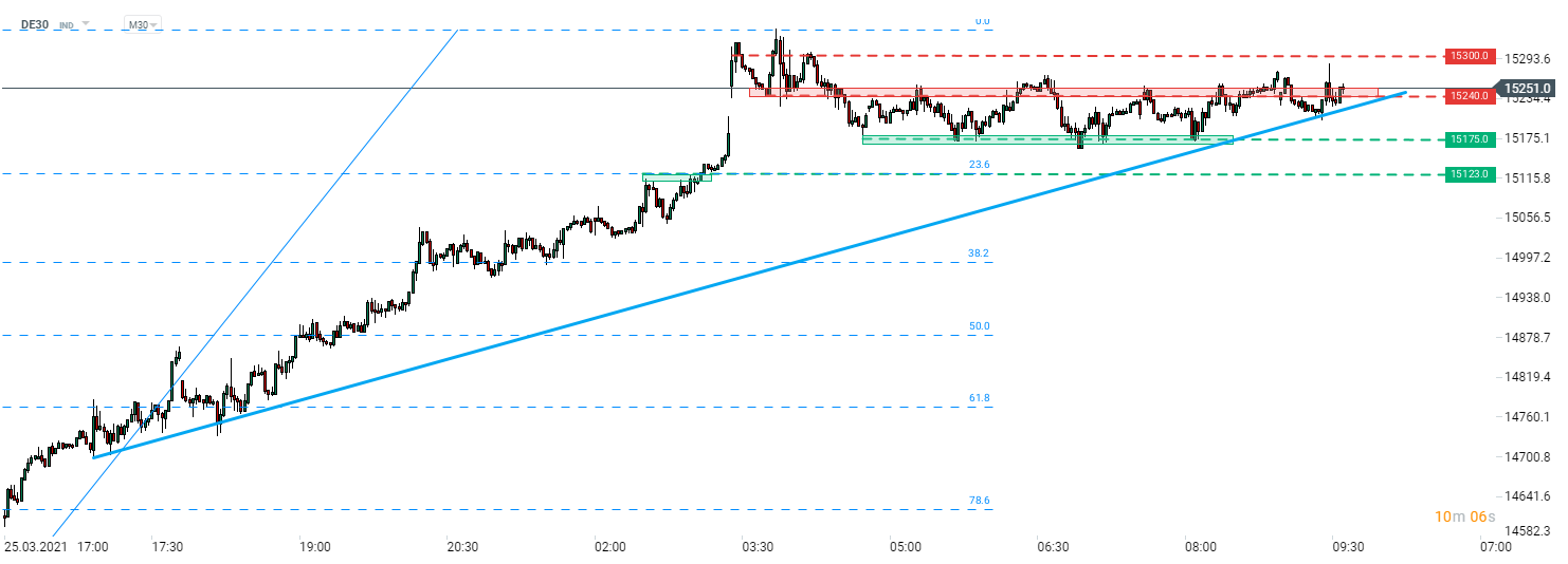 Si bien el DAX es uno de los pocos índices europeos que cotizan al alza en la actualidad, la escala de ganancias es menor. La situación técnica también ha cambiado poco. El índice intenta superar el límite superior del rango de negociación a corto plazo en 15,240 pts. El DE30 se adelantó a la apertura de efectivo europea y alcanzó un máximo diario cerca de 15,290 pts, pero este movimiento ya se ha borrado y el índice se negocia una vez más cerca del límite superior del rango. En caso de que los alcistas pierdan fuerza y comience un retroceso, el primer soporte a observar se puede encontrar en el límite inferior del rango de negociación en 15,175 pts.