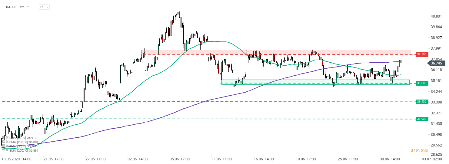 A pesar de la sombría perspectiva presentada por el CEO, Daimler (DAI.DE) se beneficia hoy de un mayor apetito por el riesgo. El precio de la acción probó un promedio móvil de 200 horas hoy, pero hasta ahora no ha podido superarlo. Un retroceso hacia el límite inferior del rango de negociación podría estar en las cartas ahora. Fuente: xStation5