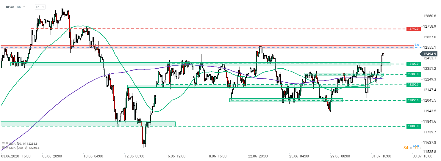 DE30 se recuperó del declive de ayer y hoy alcanzó un nuevo máximo semanal. El índice se cotiza solo una muesca por debajo de una importante zona de resistencia que oscila alrededor del 78,6% de retroceso de la venta masiva de febrero a marzo (área de 12.550 pts). La publicación de datos de empleos en los EE. UU. A la 1:30 p. M. Los niveles más cercanos a observar son: la resistencia antes mencionada a 12,550 pts y el soporte a 12,400 pts. Tenga en cuenta que hoy es el último día de negociación para las acciones estadounidenses antes de un largo fin de semana, por lo tanto, puede haber más volatilidad. A pesar de las caídas temporales, los mercados bursátiles han sido muy fuertes en los meses anteriores, por lo que podríamos ver una ruptura por encima de 12.550 pts. En tal escenario, la atención se centrará en la resistencia a corto plazo en 12,740 pts.