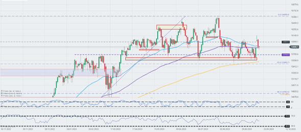 Los futuros basados en el DAX alemán se negocian intradía sin desviaciones notables, sin embargo, vale la pena señalar que el lado de la demanda logró elevar las cotizaciones por encima de la media móvil exponencial de 100 días (curva violeta), que fue perforada en la fase inicial de negociación. Fuente: xStation 5