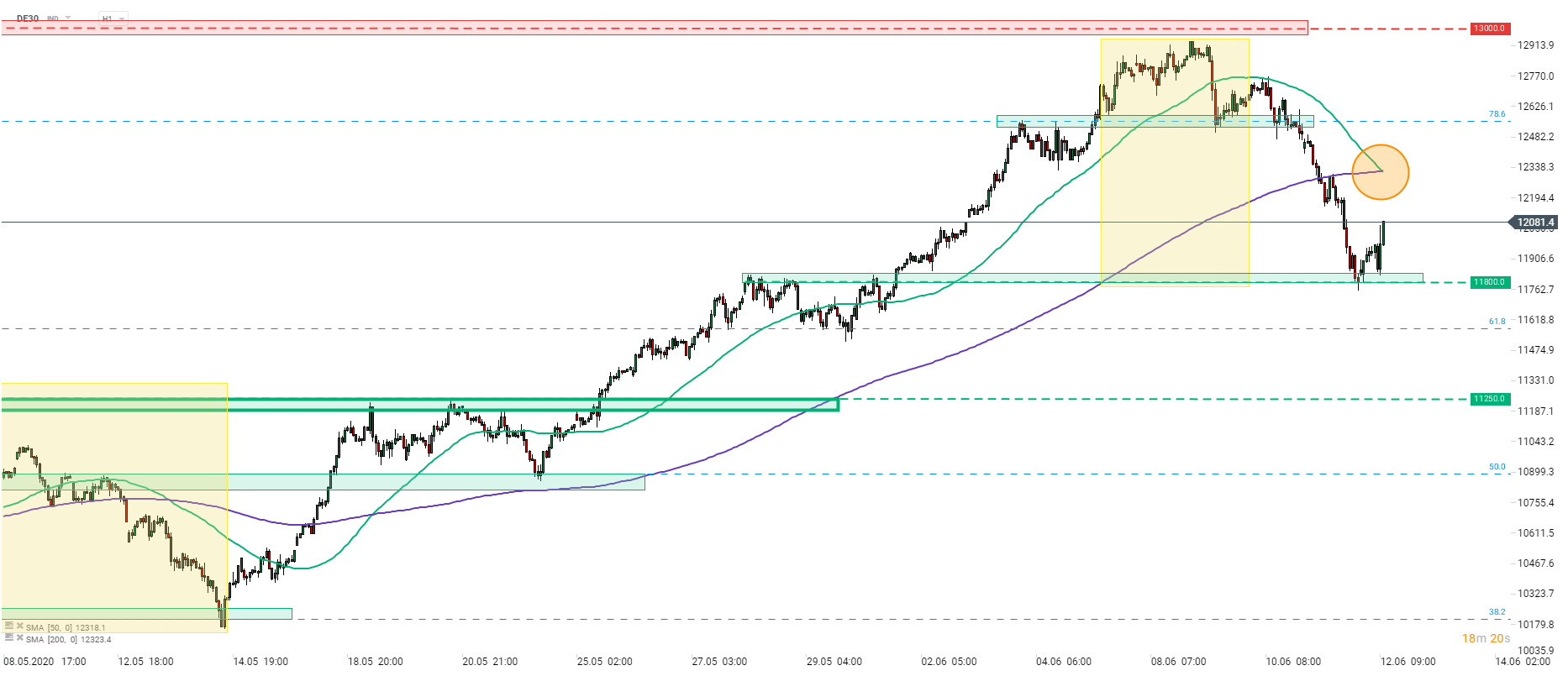 El Dax Alemán cayó alrededor del 9% desde el máximo pospandémico hasta el mínimo nocturno de hoy. Sin embargo, el índice logró detener la disminución en el área de 11.800 pts y, como se puede ver en el gráfico a continuación, este nivel está marcado con reacciones de precios anteriores, así como con el límite inferior de la estructura Overbalance. La corrección en curso coincidió con el rango del mayor retroceso anterior del impulso ascendente actual y comenzó la recuperación. Esta es una señal alentadora para los toros. Por otro lado, el promedio móvil de 50 horas está a punto de cruzar el promedio móvil de 200 horas desde arriba (círculo naranja). Tal patrón se llama 'cruz de la muerte' y se considera un patrón bajista. Sin embargo, a menudo es una señal tardía y los inversores no deberían darle mucho crédito a menos que veamos una ruptura de precios por debajo del límite inferior de la estructura de Overbalance.