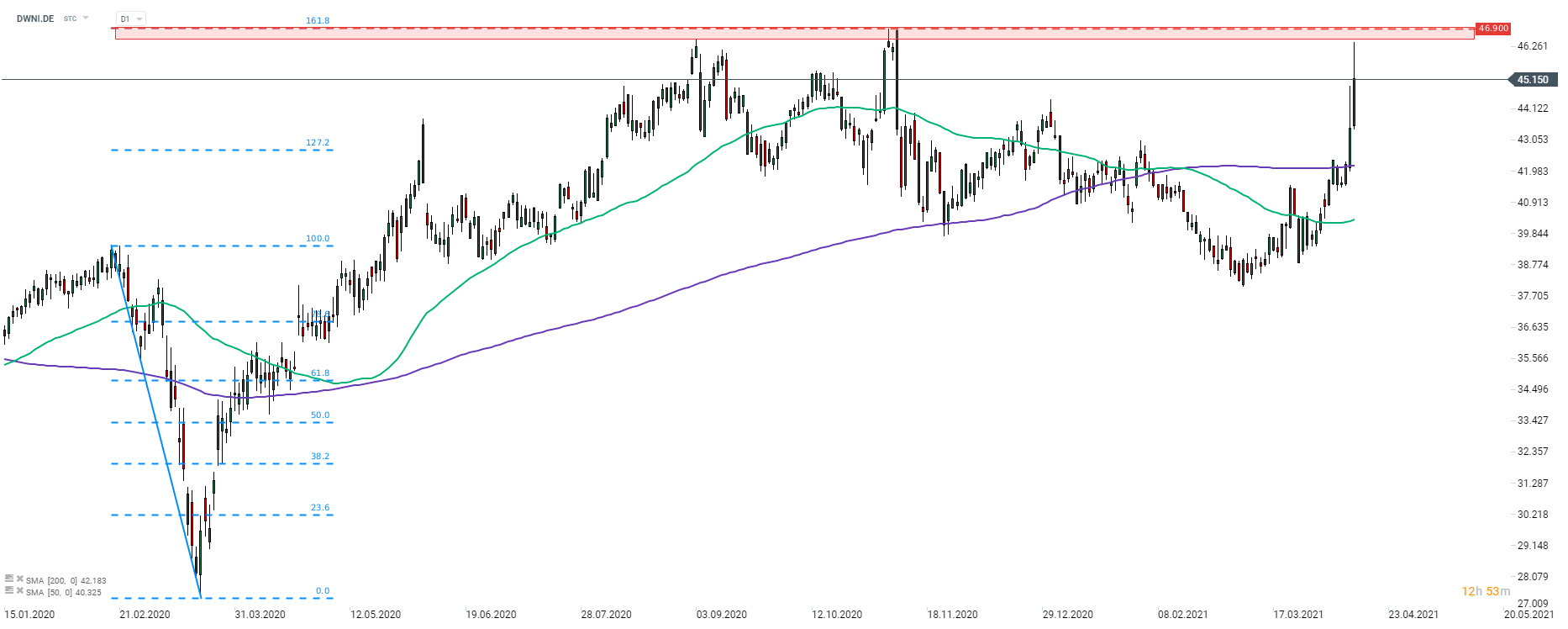 Deutsche Wohnen (DWNI.DE) comenzó a manifestarse ayer cuando se anunció que hoy se anunciará el fallo del Tribunal Constitucional sobre la congelación de alquileres en Berlín. El fallo resultó favorable para la empresa y el movimiento alcista se prolongó hoy. Las acciones cotizaron alrededor de un 7% más en un punto de la sesión y probaron la zona de resistencia por debajo de los 46,90 euros (161,8% de retroceso exterior de la caída de la pandemia de 2020. Sin embargo, parte del movimiento se ha borrado desde entonces. Fuente: xStation5