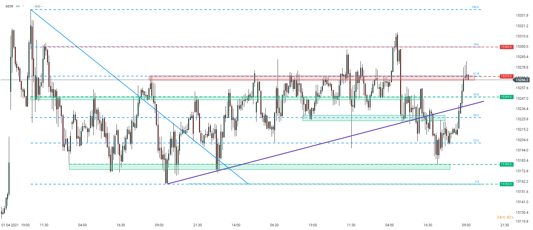 DE30 cayó por debajo de la línea de tendencia alcista ayer. El movimiento bajista se detuvo en la zona de soporte por debajo de los 15,180 pts. El movimiento de recuperación se lanzó más tarde y el índice se recuperó por encima de la línea de tendencia mencionada anteriormente y un retroceso del 50% en 15,249 pts. Un intento de romper por encima del retroceso del 61,8% en 15.270 pts se puede ver en el momento de la publicación. Sin embargo, se pueden observar mechas superiores largas en el intervalo M30, lo que sugiere que la resistencia en el área sigue siendo fuerte. En caso de que no se rompa por encima de él, puede haber un retroceso hacia el retroceso del 50%. Por otro lado, si los alcistas logran empujar a DE30 por encima de la zona de 15,270 pts, el próximo objetivo a observar se puede encontrar en 15,300 pts (retroceso del 78.6%).