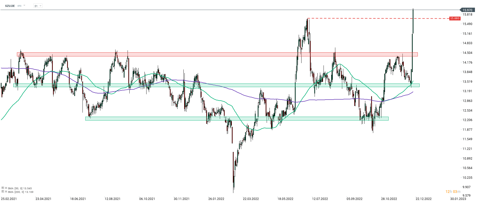 Las acciones de Suedzucker (SZU.DE) subieron tras una mejora en Warburg Research. Las acciones cotizan más de un 5% más en el día y superan el máximo de 15,68 € de julio. Las acciones cotizan al nivel más alto desde octubre de 2020. Fuente: xStation5
