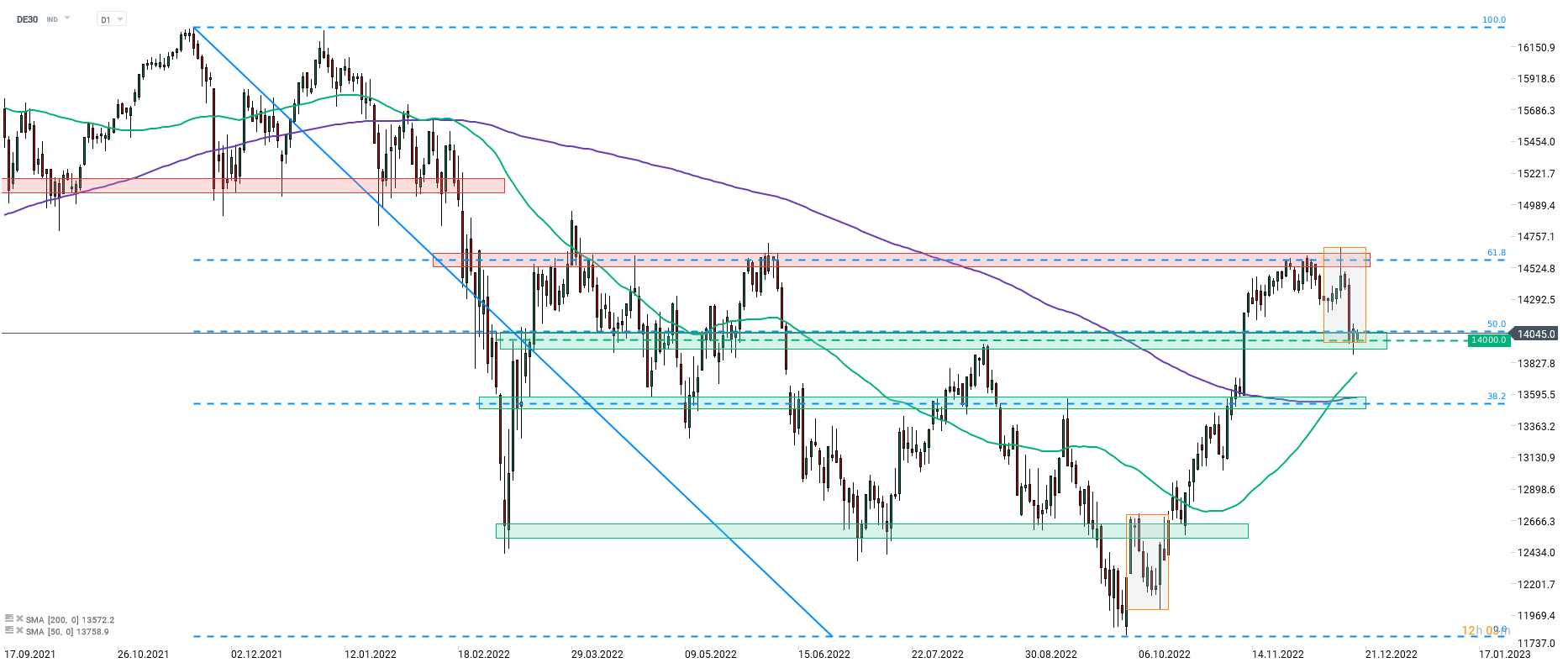 Después de 3 días de ventas, el DAX alemán (DE30) está rompiendo su racha perdedora. El índice se está recuperando de un intento fallido de romper por debajo de la zona de soporte de los 14,000 pts. y ahora está intentando romper por encima del 50% de retroceso del impulso bajista que comenzó a fines de 2021. Tenga en cuenta que el precio defendió el límite inferior de la estructura de sobre balance en el área de los 14,000 pts, lo que indica que la tendencia alcista aún está en juego y que podría haber un fuerte movimiento de recuperación. En tal escenario, la zona de resistencia de 14,600 pts, marcada con un máximo reciente y un retroceso de 61.8% será el primer objetivo para los alcistas.