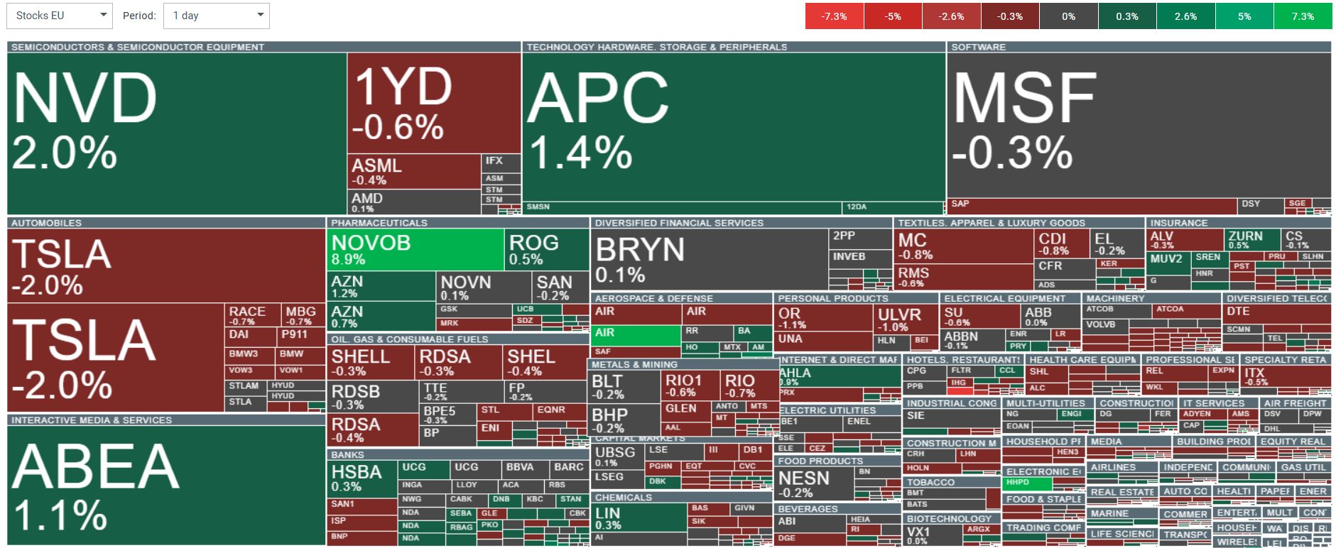 En cuanto al comportamiento sectorial del DAX alemán, solo el sector financiero (+0,18%) y el industrial (+0,08%) cotizan en territorio positivo. El sector sanitario muestra el descenso más pronunciado (-0,76%), seguido de los bienes de primera necesidad (-0,64%) y los bienes de consumo discrecional (-0,54%). Las tecnologías de la información (-0,38%), los materiales (-0,35%) y el sector inmobiliario (-0,17%) también bajan significativamente. Los servicios de comunicación (-0,07%) y los servicios públicos (-0,11%) muestran descensos más modestos. El rendimiento agregado del DAX muestra un descenso del 0,3%, con una amplitud de mercado negativa, ya que ocho de cada diez sectores cotizan a la baja.