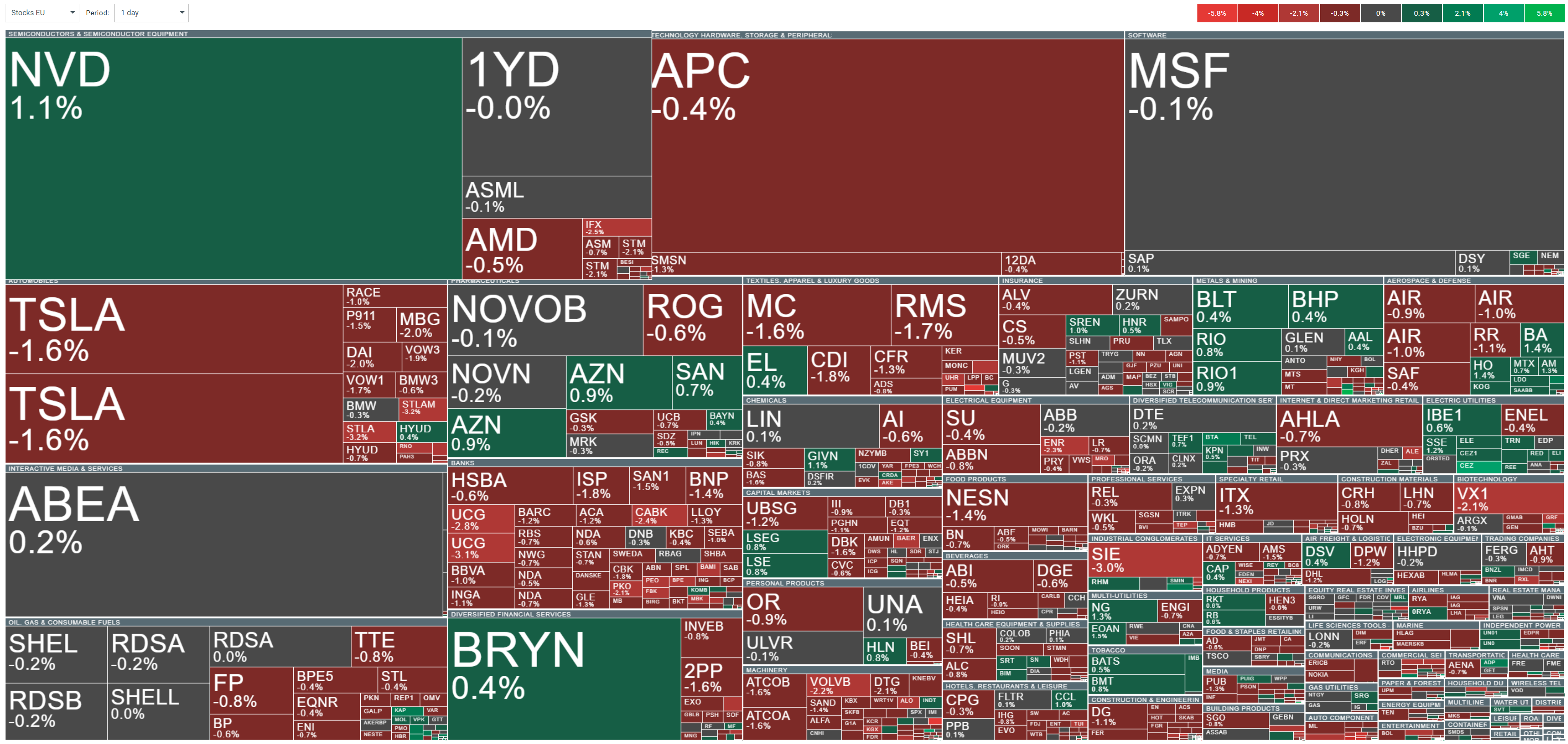 En cuanto al desempeño sectorial del DAX40, el mercado muestra un sesgo predominantemente negativo, siendo los sectores inmobiliario (+0,73%), sanitario (+0,38%) y de servicios de comunicación (+0,21%) los únicos en territorio positivo. Los sectores industriales son los de peor desempeño, con un descenso del 1,15%, seguidos de los materiales (-0,58%) y financieros (-0,36%). Las tecnologías de la información (-0,26%), los bienes de consumo básico (-0,25%) y los bienes de consumo discrecional (-0,74%) muestran distintos grados de debilidad. Los servicios públicos bajaron un 1,13%, lo que contribuyó al sentimiento negativo general. La amplitud del mercado sigue siendo un desafío, con 7 de cada 10 sectores cotizando a la baja, lo que sugiere una presión vendedora persistente en las acciones alemanas. El desempeño agregado del DAX40 muestra un descenso del 0,44%, lo que refleja la debilidad del mercado europeo.