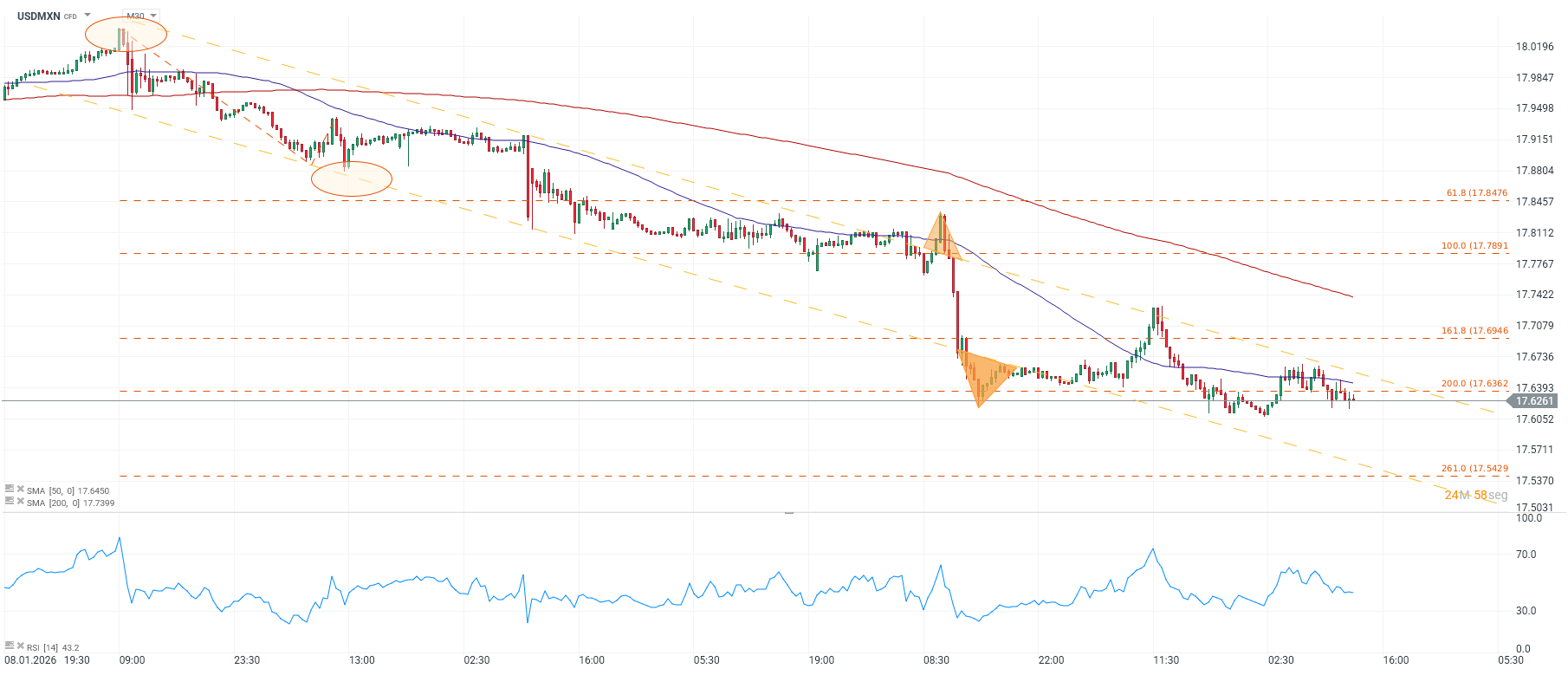 En el gráfico intradía se mantiene un sesgo de debilidad: el precio ronda 17.63, por debajo de la SMA50 (17.65) y de la SMA200 (17.74), lo que sugiere una estructura de corto/mediano plazo aún bajista. El RSI apunta a momentum moderado, sin señales extremas.