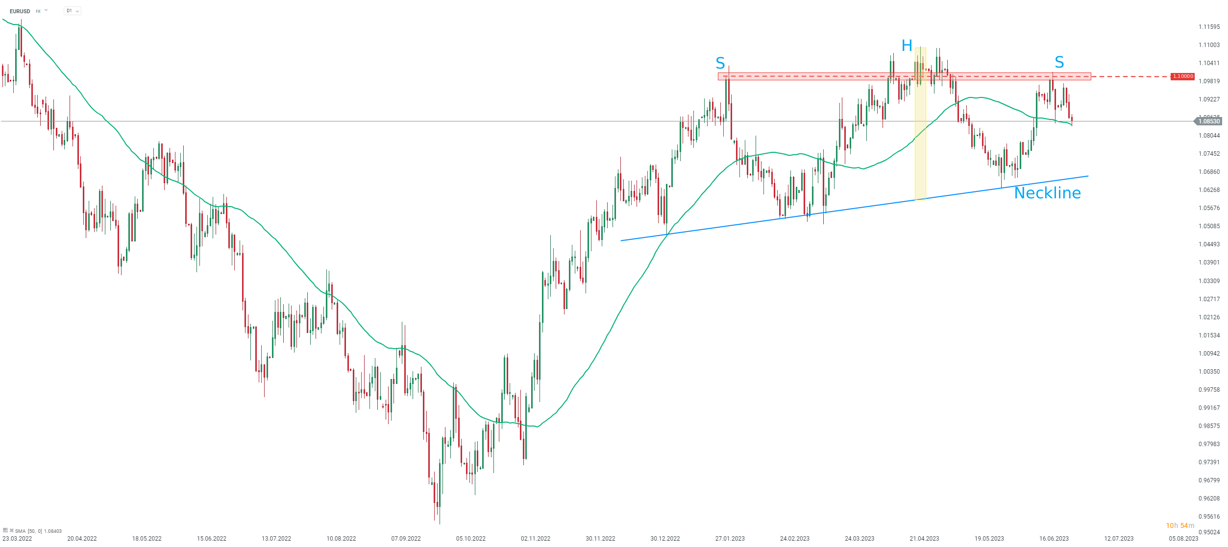 Echando un vistazo al gráfico EURUSD en el intervalo D1, podemos ver que el par de divisas principal puede haber pintado el hombro derecho del patrón de cabeza y hombros. El par está intentando romper por debajo de la media móvil de 50 sesiones (línea verde). Este obstáculo detuvo las caídas la semana pasada, pero si los bajistas logran empujar al par por debajo, el camino hacia la línea de cuello del patrón de cabeza y hombros estará entre las posibilidades.