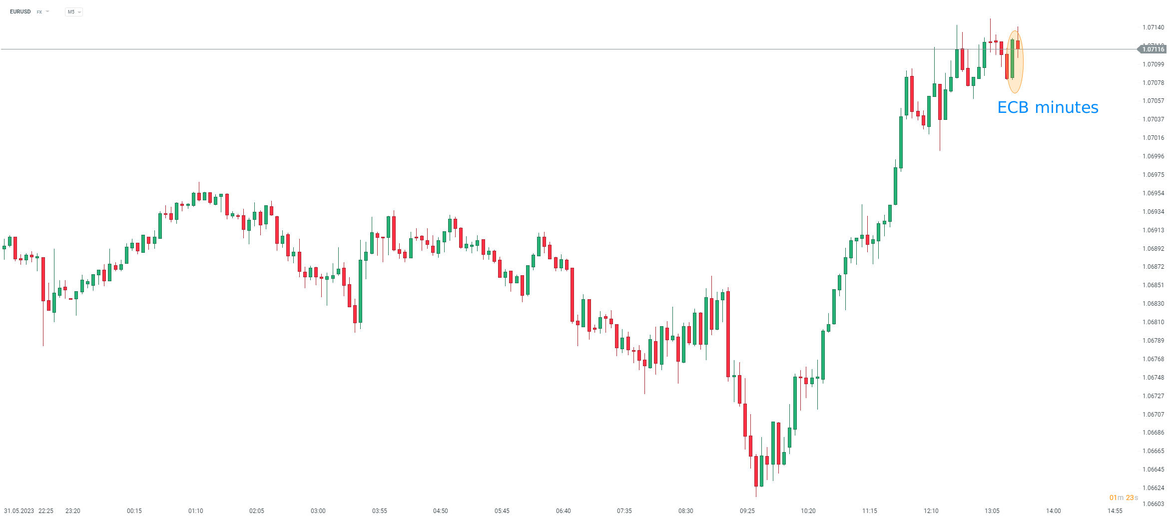 La cuenta de la reunión del BCE del 3 al 4 de mayo de 2023 se publicó hoy a las 13:30h CEST. El BCE realizó un aumento de tipos de 25 puntos básicos en esa reunión, pero el documento mostró que varios miembros del Consejo de Gobierno inicialmente expresaron su preferencia por un movimiento de tipos de 50 puntos básicos. Sin embargo, los miembros finalmente acordaron un movimiento de 25 puntos básicos que fue apoyado por casi todos los miembros. Las actas también mostraron que la comunicación de los BCE debería transmitir un claro sesgo direccional, pero hubo una fuerte preferencia en contra de una orientación directa hacia adelante.