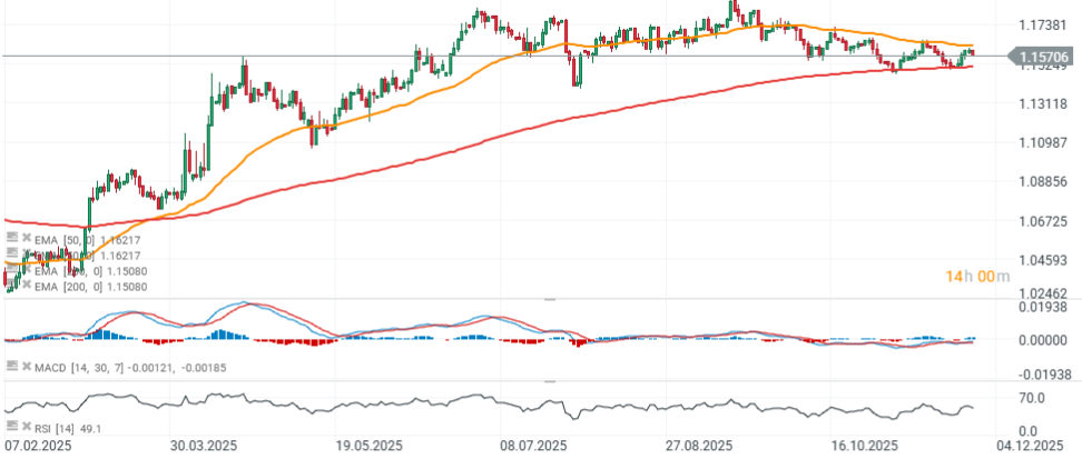 El par euro-dólar retrocede después de tres días consecutivos de subidas y actualmente se negocia en el rango medio entre la EMA200 (línea roja) y la EMA50 (línea naranja), lo que sugiere indecisión de los inversores sobre la sostenibilidad de la tendencia, a pesar de las crecientes expectativas de un recorte de tipos en diciembre, que ahora se sitúan en el 84%.