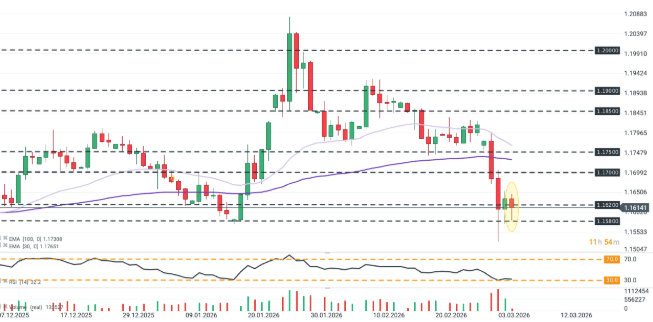 El tipo de cambio EUR/USD volvió a caer por debajo de 1,1600 en respuesta al retorno de las subidas del petróleo y al enfriamiento del apetito de riesgo temporal en Wall Street. Sin embargo, la debilidad de la moneda común fue limitada por supuestos comentarios de Irán sobre el Estrecho de Ormuz y por el nuevo ajuste del mercado respecto a posibles subidas de tipos en la Eurozona.