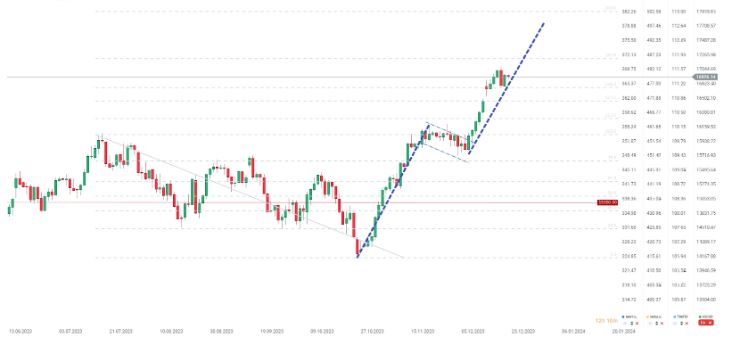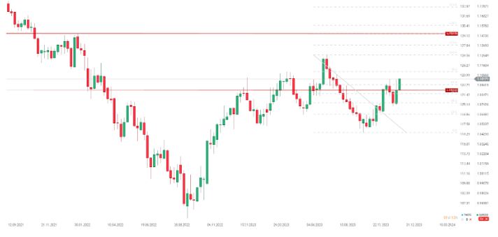 Los mercados monetarios están valorando una probabilidad de alrededor del 80% de que la Fed aplique el primer recorte de tipos en la reunión de marzo de 2024. Sin embargo, si los datos de inflación son inferiores a lo esperado, esas apuestas moderadas pueden aumentar aún más y permitir que los índices sigan cotizando a niveles récord y permitir que el eurodólar termine el año por encima de 1,10.