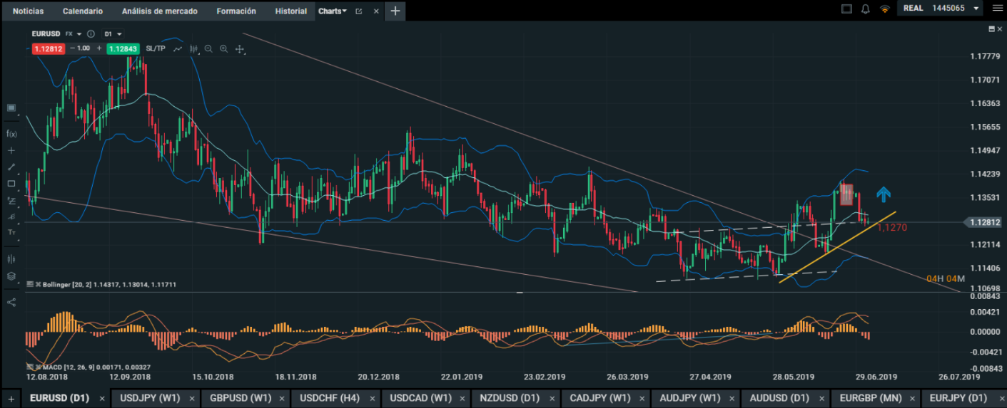 Gráficos diarios nos muestran el quiebre de una cuña bajista, y el inicio de un cambio de escenario al alza. Con mínimos ascendentes a través de una línea amarilla enmarcamos el nuevo rally sobre la directriz, siendo la zona de congestión mencionada en 1,1260 el tercer apoyo, y nivel de inflexión para mantener la visión alcista.