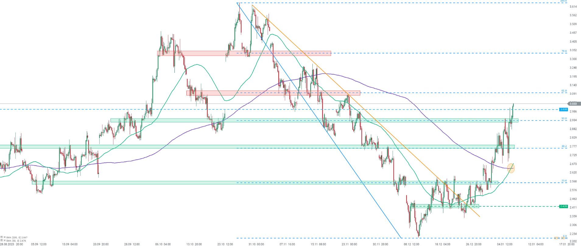 Si observamos el gráfico de NATGAS en el intervalo H4, podemos ver que el precio ya ha subido alrededor de un 35% desde un mínimo local alcanzado hace menos de un mes (13 de diciembre de 2023). El movimiento ha sido muy rápido y se ha acelerado claramente tras una ruptura por encima de la media móvil de 200 períodos (línea morada). Los pronósticos meteorológicos cada vez más fríos en Estados Unidos proporcionaron combustible para el repunte, con NATGAS saltando hoy por encima de la marca psicológica de 3,00 dólares por MMBTu. Los alcistas también lograron superar este nivel ayer, pero la ruptura fue breve y el precio retrocedió rápidamente. El siguiente nivel de resistencia a observar se puede encontrar alrededor del retroceso del 61,8% del movimiento a la baja lanzado a finales de octubre y noviembre de 2023 (área de 3,10 dólares). Un punto a tener en cuenta es que el promedio móvil de 50 períodos recientemente superó el promedio móvil de 200 períodos (círculo naranja), dibujando un patrón alcista conocido como "cruz dorada".