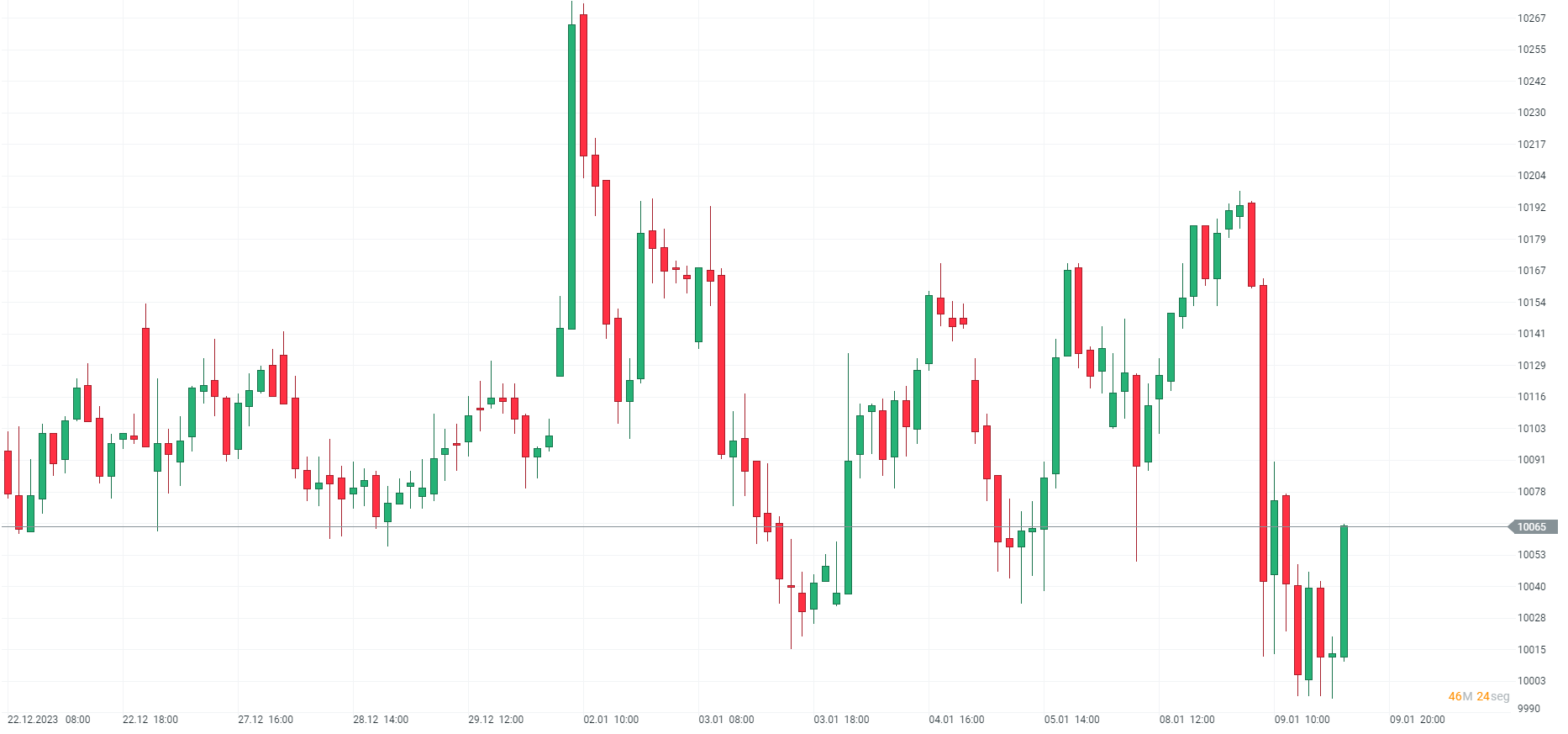 El Ibex cae por debajo de los 10.000 puntos, pero los recupera con relativa rapidez y sigue cotizando alrededor de esos rangos.