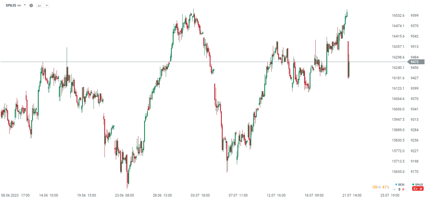 El índice SPA35 (IBEX35) está perdiendo fuertemente en la apertura debido a la incertidumbre sobre la formación de un nuevo gobierno. SPA35 abre con un gap, el más bajo desde el 18 de julio. Fuente: xStation5