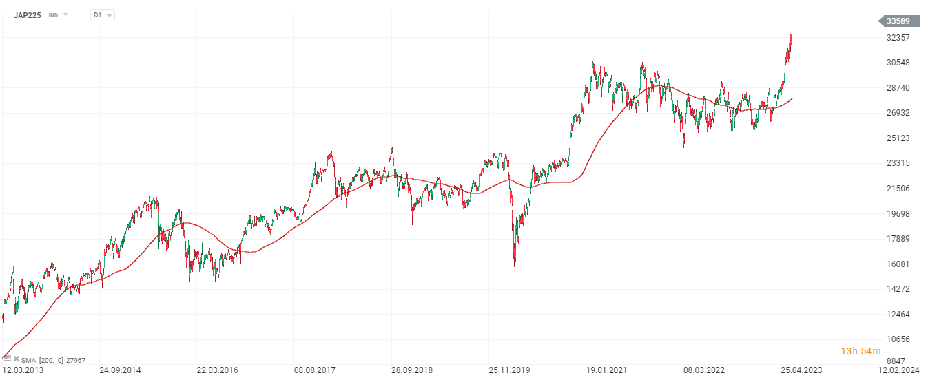 El índice bursátil Nikkei de Japón cerró la sesión de ayer en máximos de 33 años vistos por última vez en 1989, por encima de los 33.000 puntos, y hoy los contratos en el índice (JAP225) amplían las ganancias, antes de la decisión de la Fed. El índice está siendo impulsado por un yen debilitado y repuntes en las acciones de las empresas más grandes de Japón, - ayer las acciones de Toyota (TM.US) en particular se sumaron a las alzas. El repunte del Nikkei de Japón estuvo impulsado por los índices S&P 500 y Nasdaq de Estados Unidos, que ayer registraron sus cierres más altos en 14 meses.