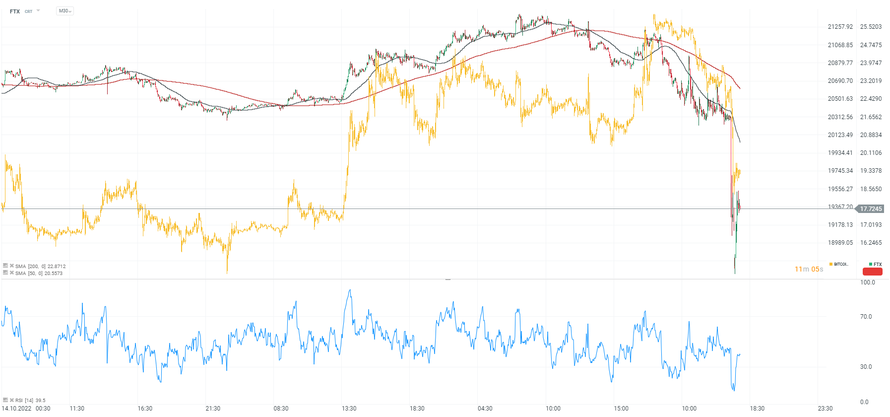 Gráfico FTX, intervalo M30. El gran movimiento de la criptomoneda FTX trajo consigo una ola de liquidación que se extendió al mercado de criptomonedas en general. El token no pudo mantenerse a $22 después de que Binance se negara a vender tokens a Alameda a ese precio. Bitcoin (gráfico amarillo) retrocedió al área de 19.700$. Fuente: xStation5