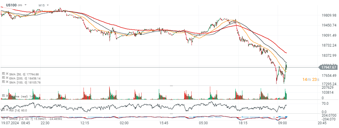 Los futuros del Nasdaq 100 (US100) intentan evitar una corrección y rebotar desde alrededor de 17.300 hasta cerca de 18.000 puntos, donde vemos la media móvil simple de 100 sesiones (SMA100, línea negra) y un importante nivel de resistencia psicológica.