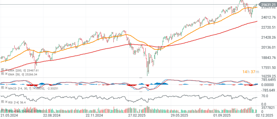 El Nasdaq 100 se mantiene por encima de las dos medias móviles clave: la EMA50 (naranja) y la EMA200 (roja). El índice puede consolidarse entre 23.500 y 25.900 puntos antes de determinar su próxima dirección. Si se produce una ruptura al alza, se abrirá el camino hacia la zona de máximos en los 26.100 puntos. En la otra dirección, el primer soporte relevante aparece en los 22.400 puntos. Por otro lado, las expectativas para 2026 siguen siendo positivas, lo que podría impulsar un "rally de Navidad" en el parqué estadounidense.