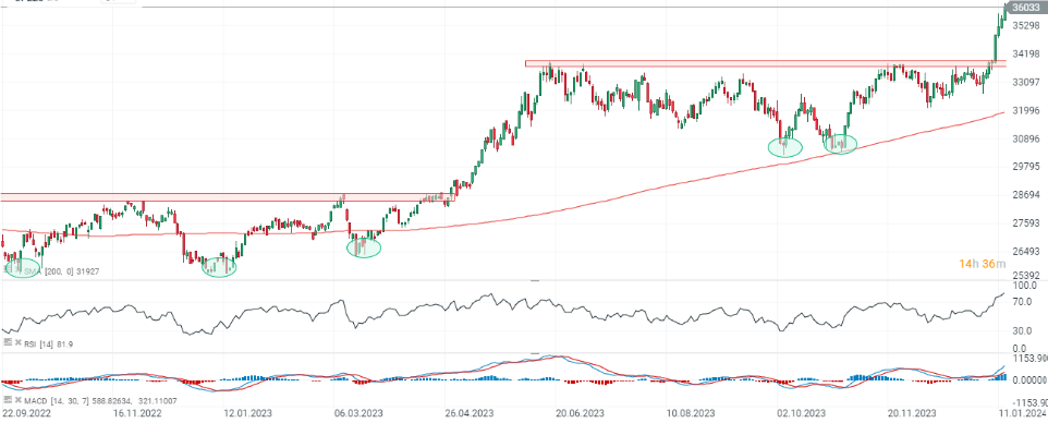 Los futuros del Nikkei225 cotizan hoy con un repunte de más del 1,2%, y el índice de referencia al contado subió durante la sesión asiática a un nivel de 36.008 puntos, el nivel más alto desde hace más de 34 años (febrero de 1990). Una mayor estabilización del yen japonés a niveles más bajos y una caída en los rendimientos de los bonos estadounidenses están impulsando los precios de las acciones.