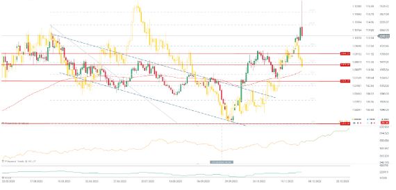 Hoy, sin embargo, prevaleció la fortaleza del dólar y, además, estamos asistiendo a la recogida de beneficios en el oro después de un espectacular repunte de dos días. ¡El precio ya ha bajado más de 100 dólares por onza! A diario, el oro pierde alrededor de un 1,2%, aunque anteriormente había ganado casi un 4%. Vale la pena mencionar que hoy el par del euro contra el dólar retrocede aproximadamente un 0,5% y en el gráfico podemos ver la formación de una gran divergencia entre el precio del oro y el eurodolar.