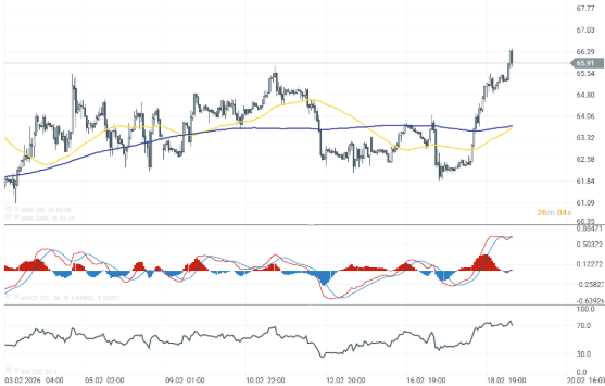 El crudo ha rebotado con fuerza desde la zona de soporte de 62–63 dólares y ahora está poniendo a prueba una resistencia clave en el rango 66–67 dólares. Una ruptura clara por encima de este nivel abriría el camino hacia 70,50 dólares y podría aumentar aún más la prima geopolítica en los precios.