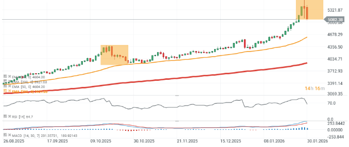 Actualmente, el oro está poniendo a prueba la EMA200 (línea roja) cerca de los 5.100 dólares por onza. La volatilidad sigue elevada y los alcistas podrían intentar revertir el movimiento rápidamente. Una zona de soporte potencialmente sólida aparece en torno a los 4.600–4.700 dólares por onza (una desviación estándar).