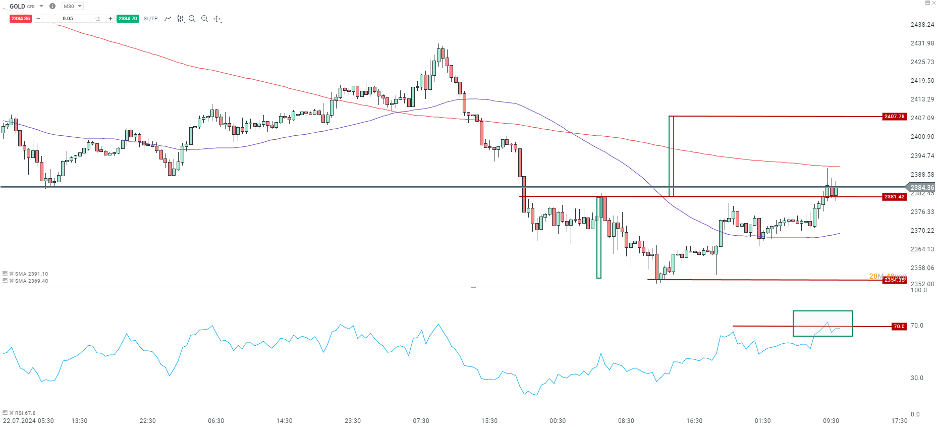 El oro ha realizado una reciente ruptura de la resistencia clave en 2381, lo cual indica el fin de la secuencia de máximos decrecientes, sugiriendo un posible cambio de tendencia al alza a corto plazo. Además, la SMA de 50 periodos ha cambiado su pendiente a positiva, indicando la posibilidad de un cruce dorado con la SMA de 200 periodos. La amplitud del siguiente impulso sugiere un objetivo técnico mínimo en 2407.