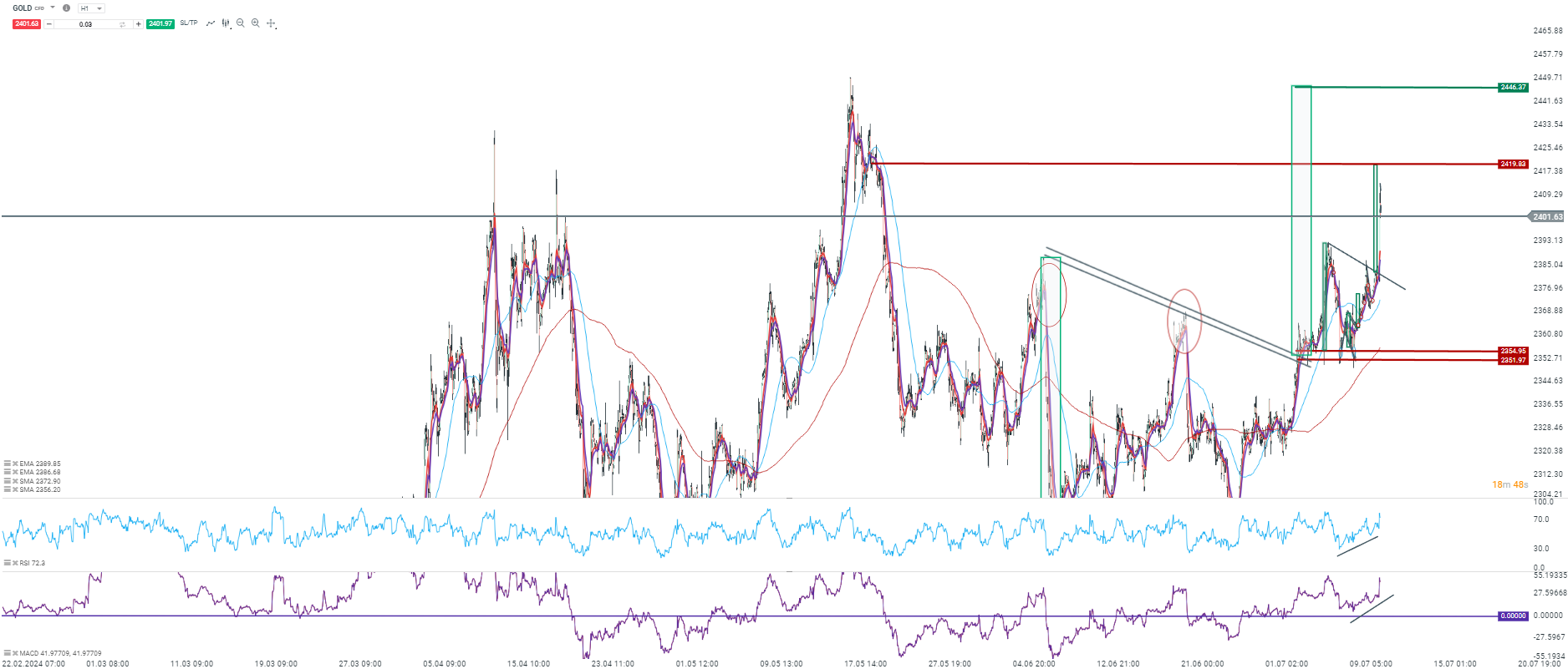 El precio del Oro muestra una fuerte tendencia alcista reciente, con una clara ruptura de resistencias importantes. El precio ha alcanzado un nuevo máximo en 2419.84 y se encuentra cerca de la sobrecompra. Si el precio rompe la resistencia en 2419.84, podríamos ver un movimiento hacia el próximo objetivo en 2446.37. Si el precio cae por debajo del soporte clave en 2354.95, el siguiente nivel de soporte se encuentra en 2381.97, lo que podría representar una oportunidad para posiciones cortas.