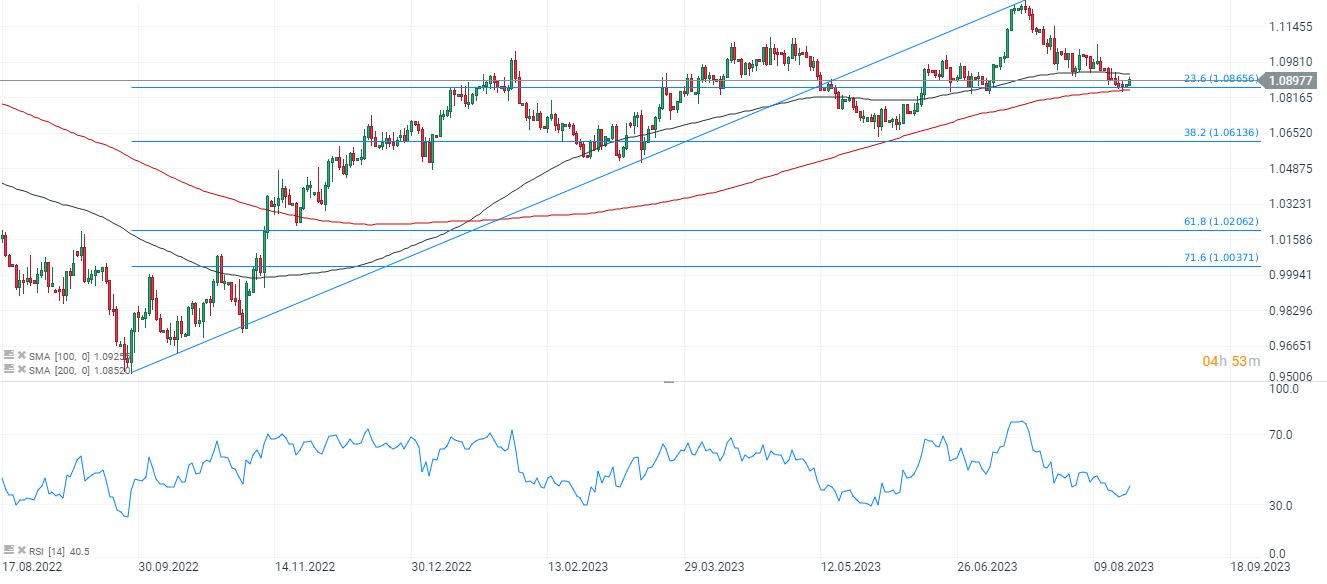 El gráfico del EUR/USD en el intervalo D1 muestra que el precio se detuvo recientemente en un soporte clave para un posible impulso adicional, definido por la SMA de 200 (la línea roja, que se utiliza para determinar convencionalmente la tendencia) y el nivel del 23.6% de Fibonacci de la onda alcista desde el otoño de 2022. Para los compradores, una resistencia importante se encuentra ahora en 1.0925 donde se encuentra la SMA de 100 (línea negra). Superarla podría abrir el camino hacia niveles por encima de 1.10.